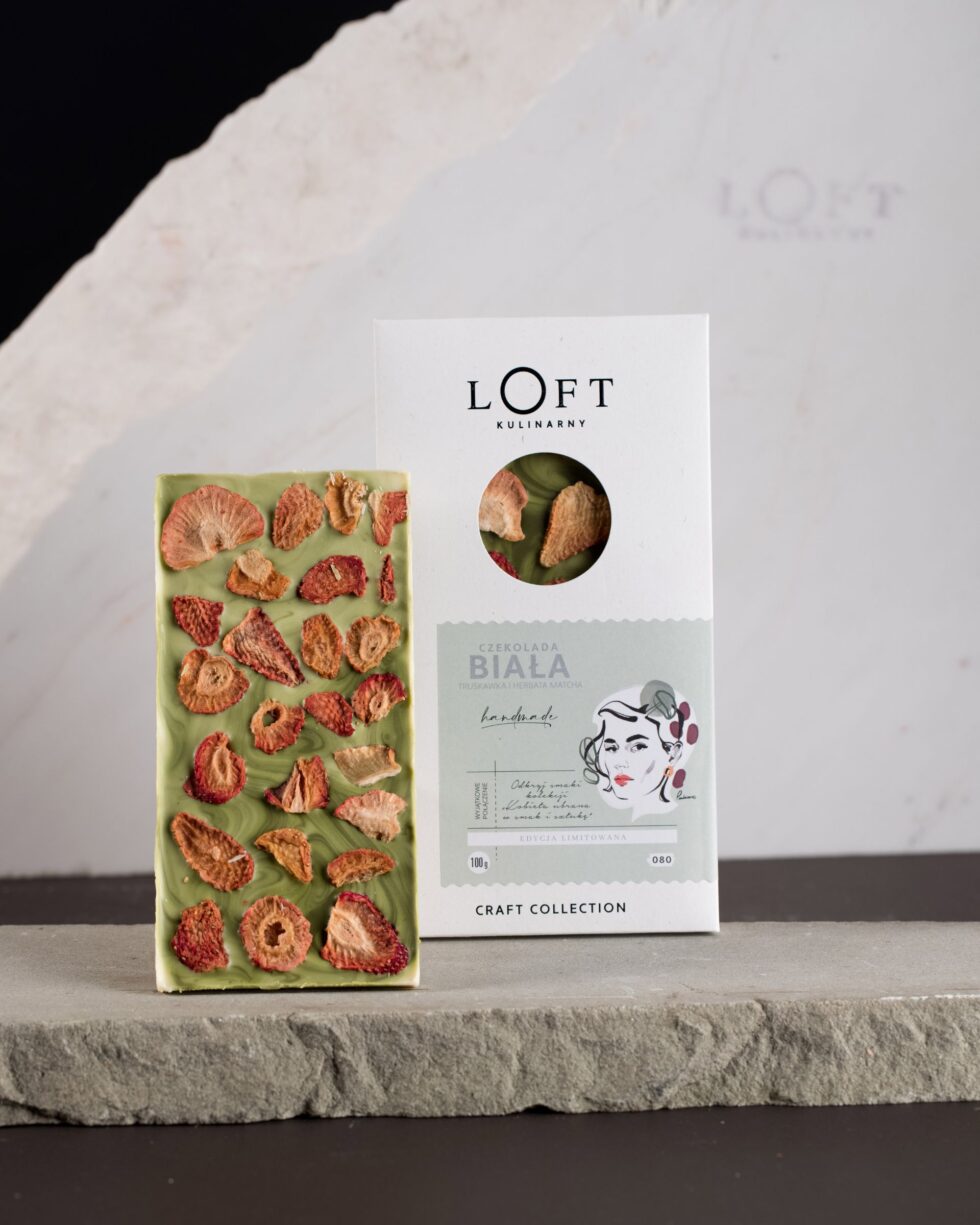 Czekolada biała z truskawkami i herbatą matcha to więcej niż deser – to kulinarne dzieło sztuki. Dzięki ilustracji Magdaleny Pankiewicz opakowanie czekolady staje się wyjątkowym elementem kolekcji, łącząc sztukę i smak w harmonijną całość.