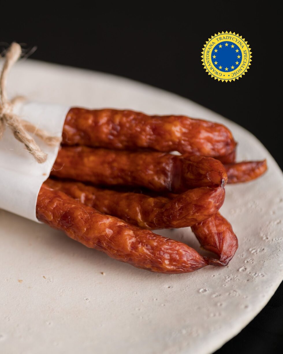 KIEŁBASA WIEPRZOWA ŚREDNIO ROZDROBNIONA, WĘDZONA, PIECZONA, SUSZONA W NATURALNYM BARANIM JELICIE.