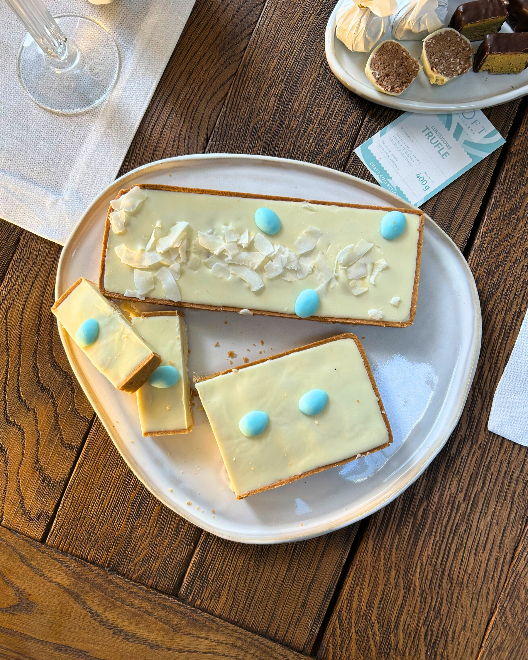Wyjątkowa wariacja na temat tradycyjnego mazurka – delikatne, kruche ciasto sablé z dodatkiem mielonych migdałów stanowi szlachetną podstawę dla aksamitnego kokosowego ganaszu z subtelną nutą alkoholu. Smak dopełniają prażone migdały, które dodają wyrazistości i lekkiej chrupkości.