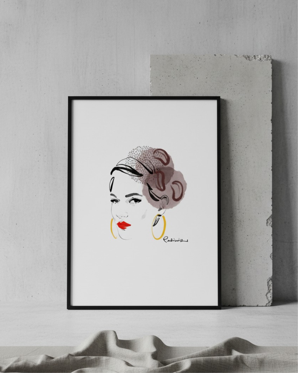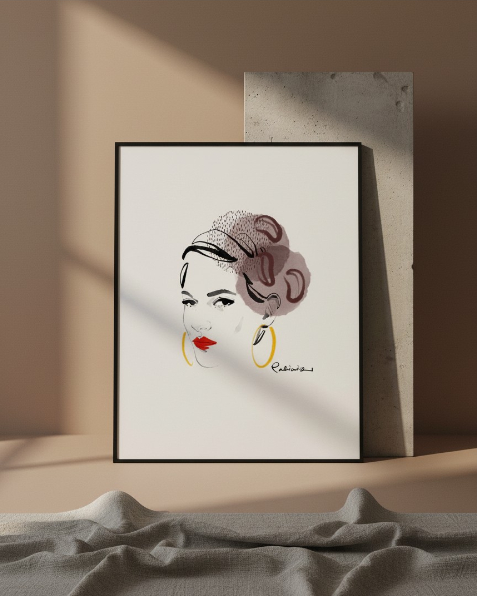 W grafice najmocniej wybrzmiewają kontrasty. Intensywna czerwień ust, złote kolczyki w formie dużych kół i miękko opracowane włosy w przygaszonych, ciepłych brązach tworzą kompozycję pełną kobiecości, ale bez przesadnej dosłowności. Ten plakat ma w sobie szyk, lekkość i artystyczną swobodę, dzięki czemu może stać się ciekawym akcentem zarówno w salonie, sypialni, domowym biurze, jak i w przestrzeni bardziej prywatnej – tam, gdzie chcesz budować wnętrze z wyczuciem i własnym rytmem.