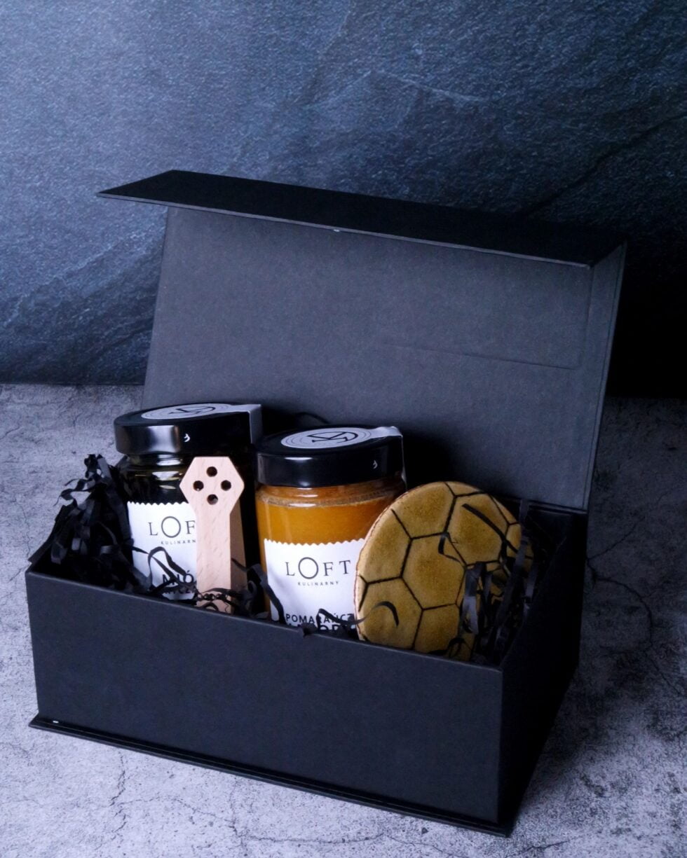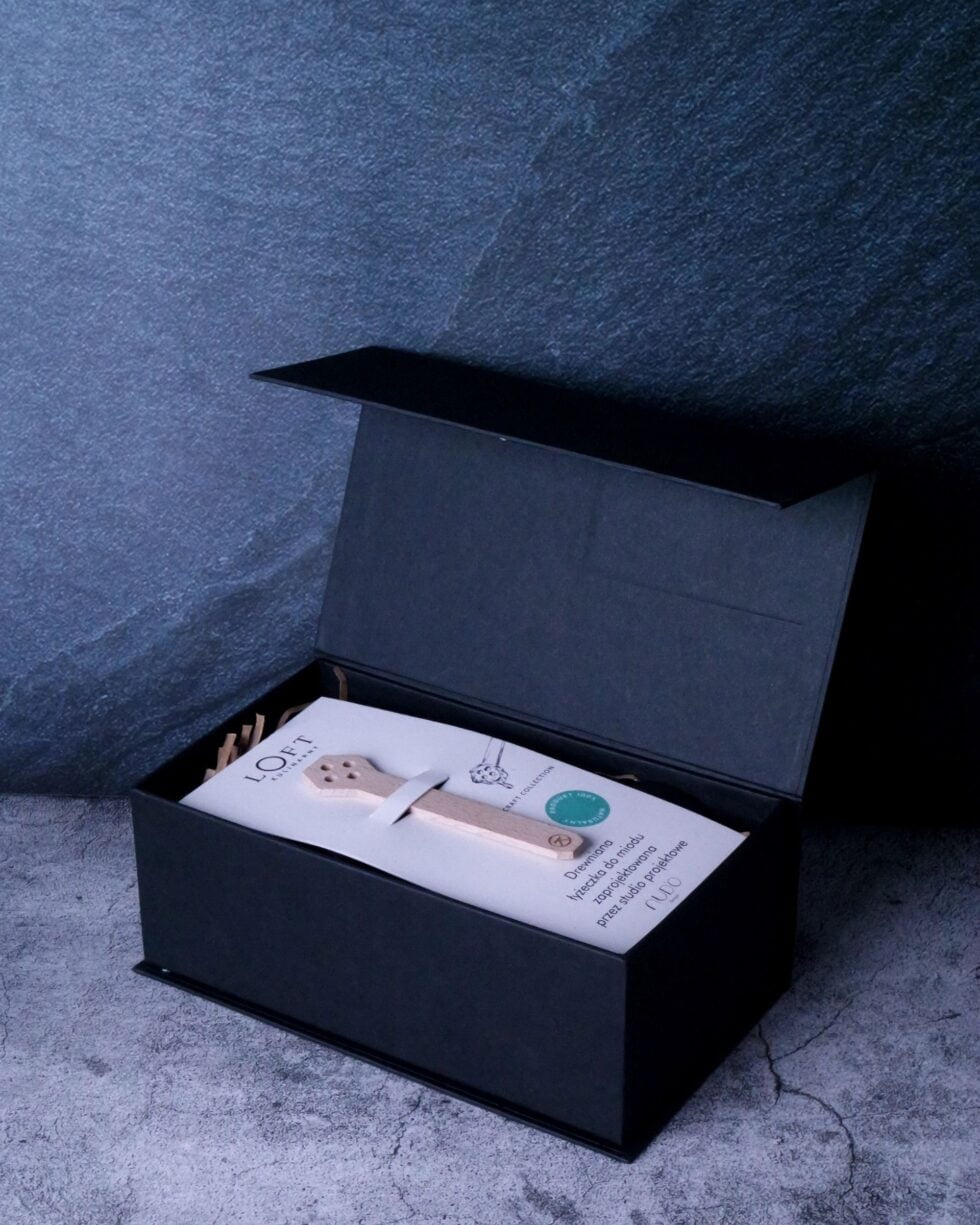 Zestaw miodowy z łyżeczką Nudo Design, to prezent idealny dla wszystkich kochających miód. Piękne, czarne pudełeczko na magnes, które skrywa 2 miody: czysty gryczany oraz wielokwiatowy z pomarańczami. Do kompletu piękna podkładka ceramiczna plaster miodu, oraz drewniana łyżeczka zaprojektowana przez studio Nudo Design.