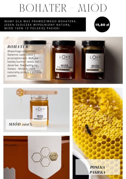Wspomaga odporność. Świetnie radzi sobie z przeziębieniem. Bohater każdej kuchni i wielu dań i deserów. Niezbędny na Święta – Miód w 100% naturalny prosto z polskiej pasieki.