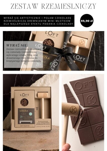 Zestaw rzemieślniczy składający się czekolady rzemieślniczej wybranego smaku 100g, oraz drewnianego mini młotka do kreatywnego łamania czekolady.