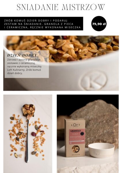 Zdrowa i pyszna granola w zestawie z ceramiczną, ręcznie wykonaną miseczką Loft Kulinarny. Zrób komuś dzień dobry.