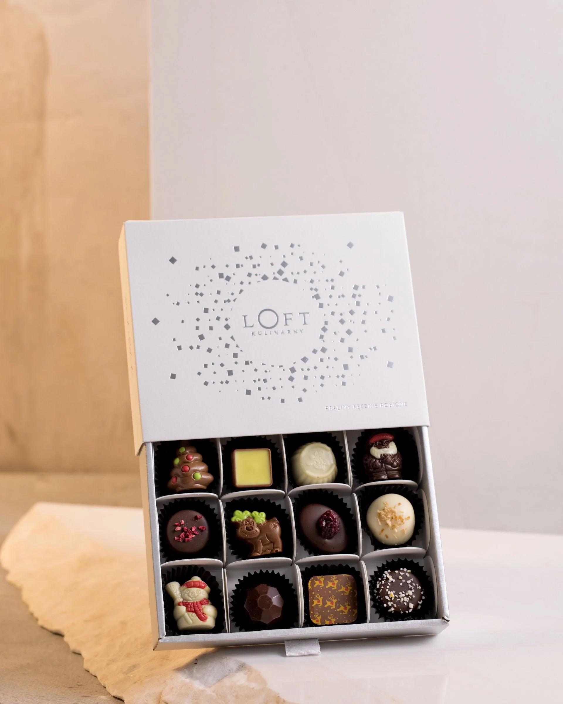 Pudełeczko zawiera 12 szt. pralin w tym kilka w świątecznym kształcie. Całość zapakowana w limitowane, świąteczne białe pudełeczko ze srebrnym wykończeniem.