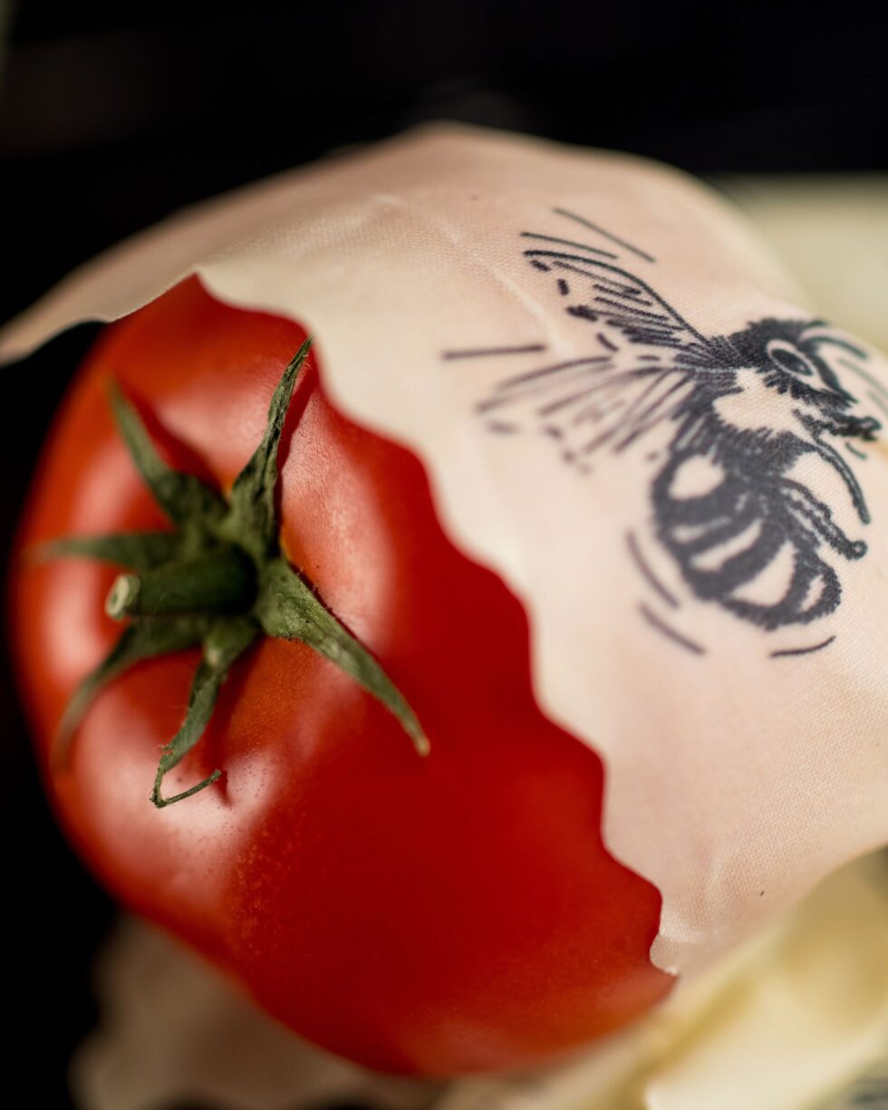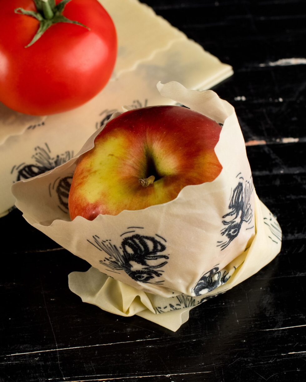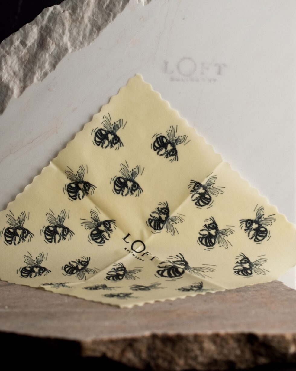Zestaw dwóch woskowijek pokryte rysunkami pszczoły autorstwa Poli Dwurnik. Woskowijki wspierają projekt społeczny Zróbmy to razem dla Pszczół – cześć zysku z każdej woskowijki przekazujemy na budowę edukacyjnego centrum pszczelego w Fundacji Pociechom w Warszawie.