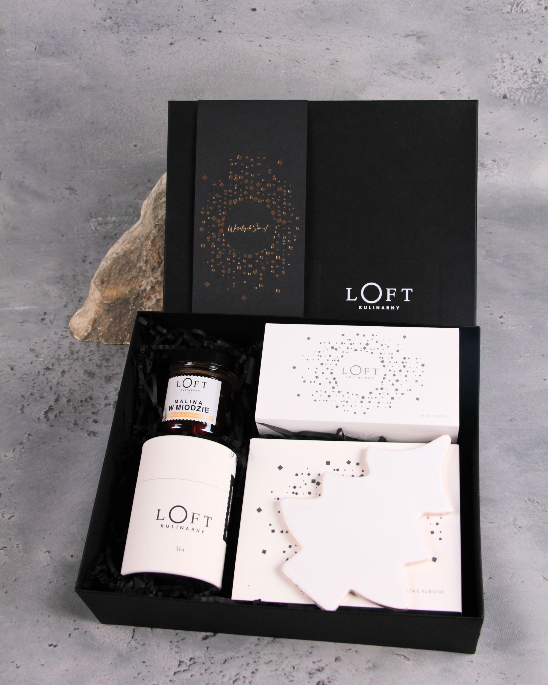 Patera ceramiczna choinka 18,5 x 14 cmPudełko dwuklapowe czarne 33 x 27 x h. 9,5 cm Owijka „Wesołych Świąt” czarna lub biała z HS