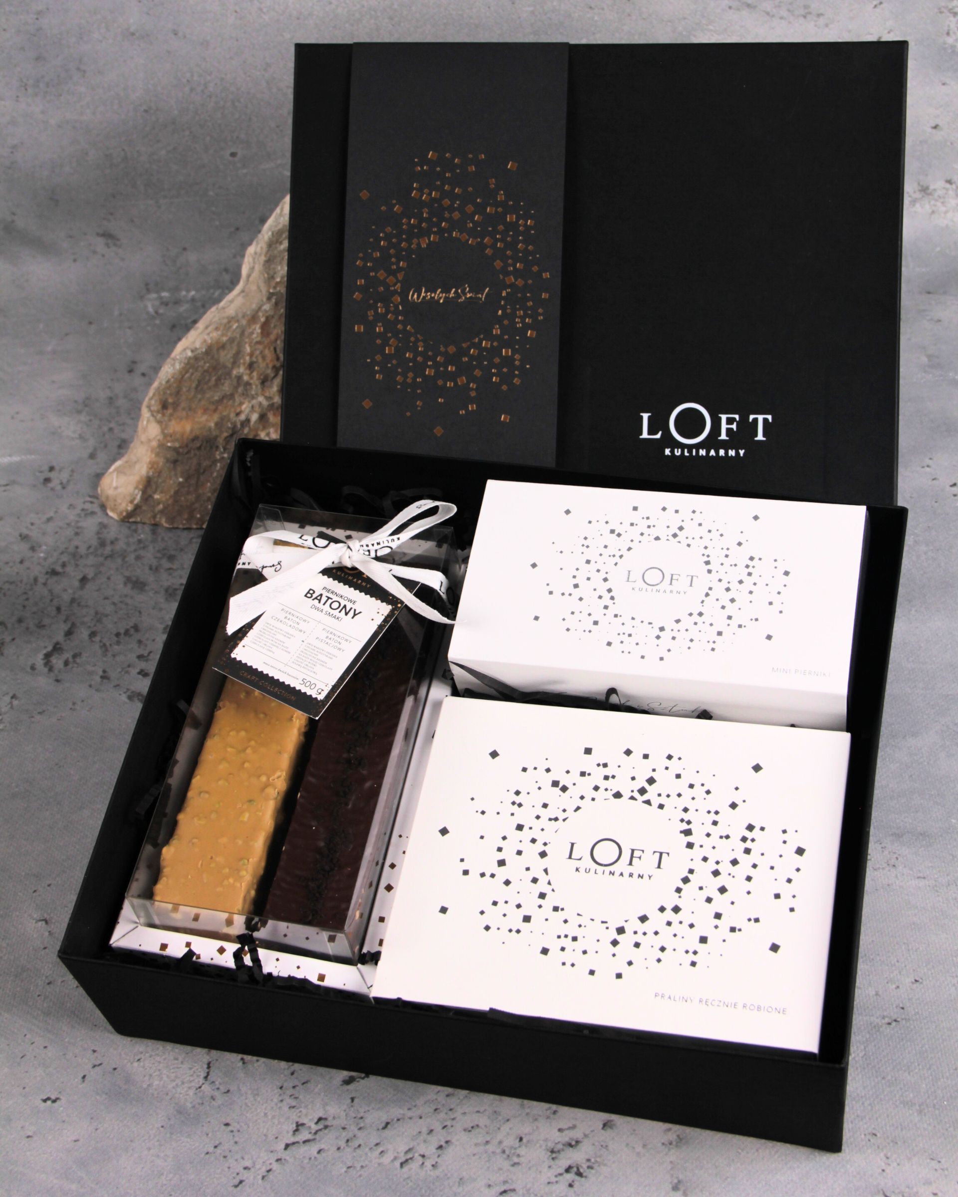 Pierniki mini gwiazdki 120g 18 sztukPudełko dwuklapowe czarne 33 x 27 x h. 9,5 cm Owijka „Wesołych Świąt” czarna lub biała z HS