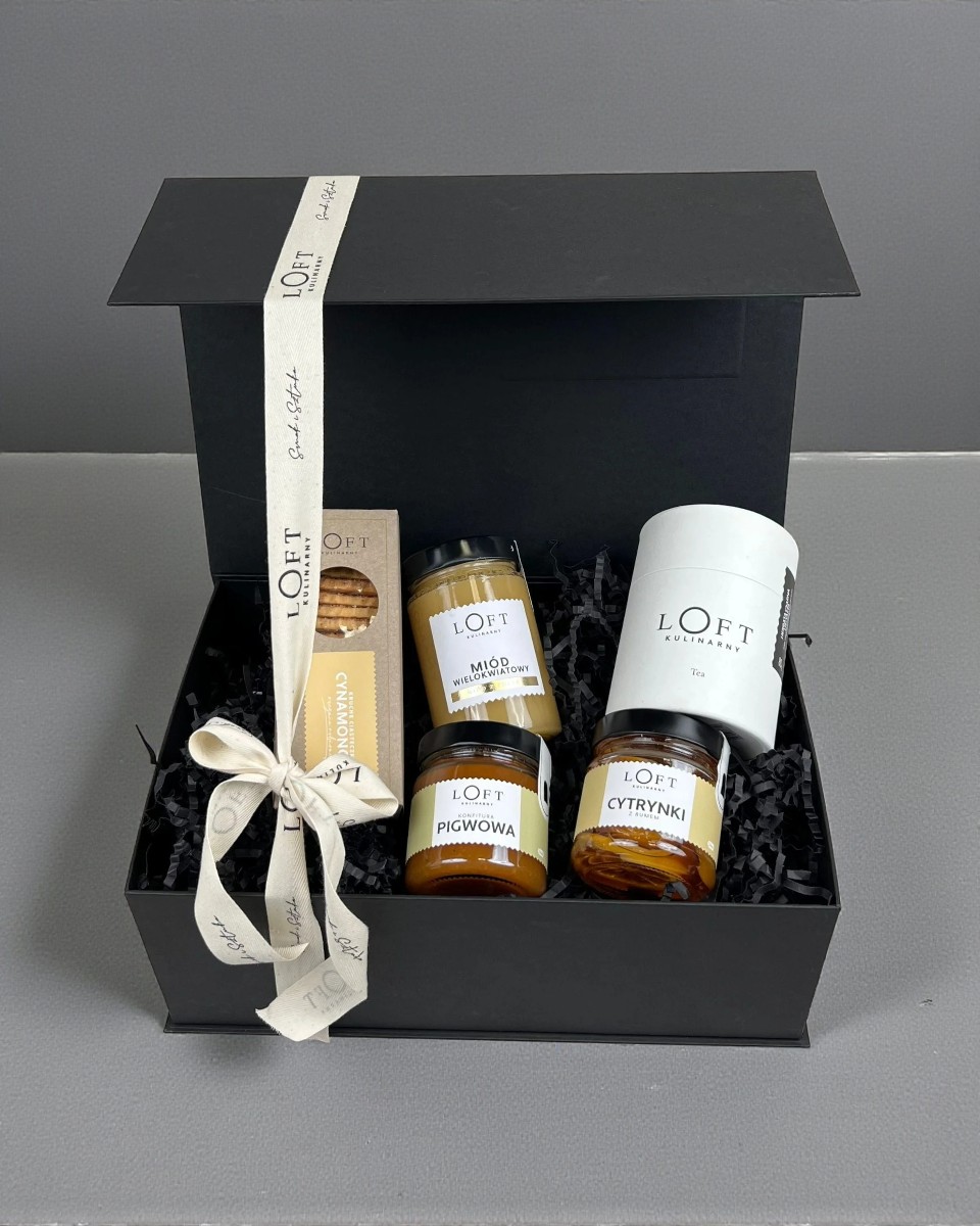 Zestaw herbaciany na popołudniową chwilę dla siebie przy ulubionej herbacie. W zestawie znajdziesz herbatę owocową z dziką różą i hibiskusem, słoiczek naszego miodu wielokwiatowego 400g, słoiczek konfitury pigwowej 220g, cytrynki z imbirem 230g i coś pysznego do chrupania – nasze bestsellerowe kruche ciasteczka cynamonowe 200g.