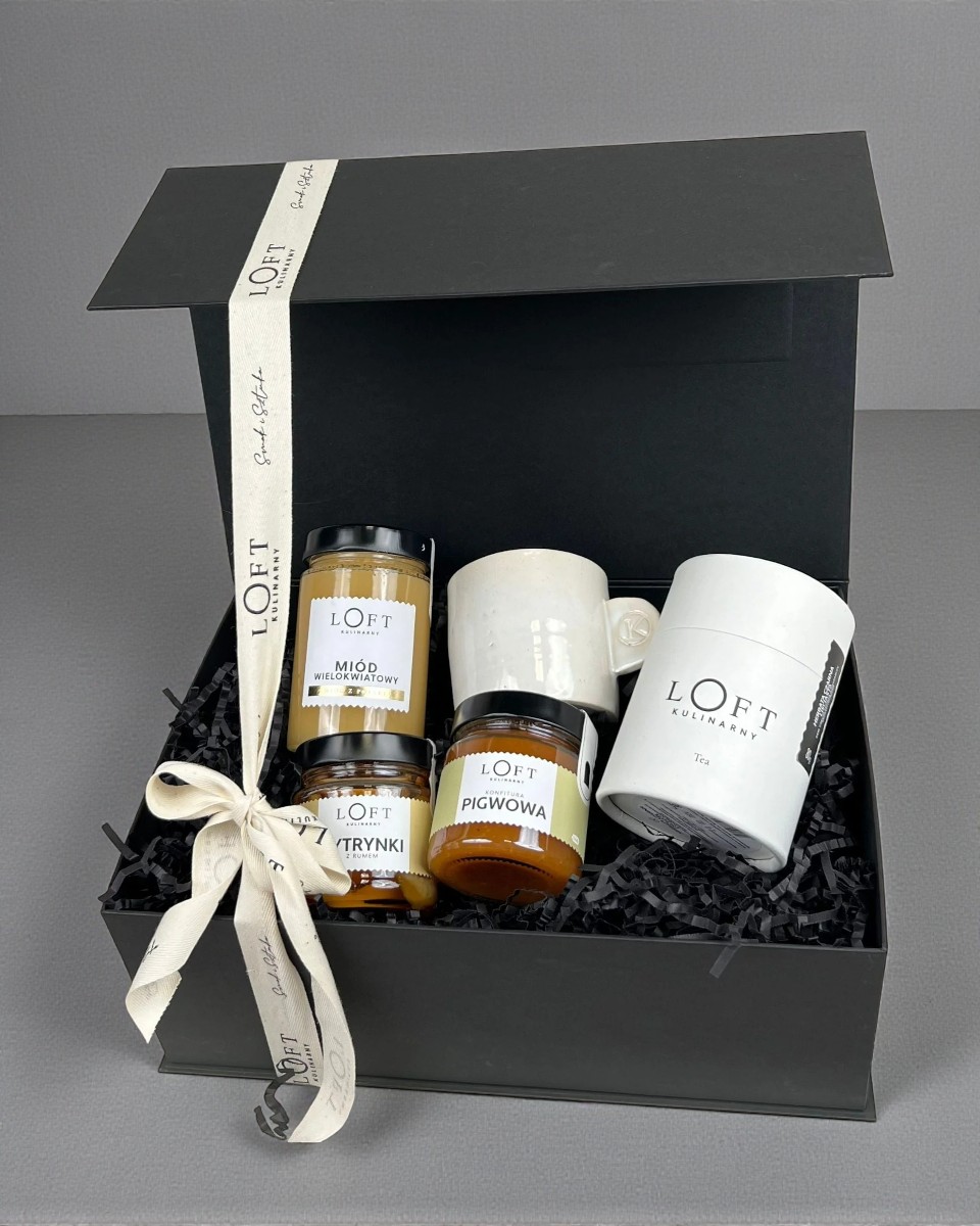 Zestaw zapakowany w eleganckie, czarne pudełko zamykane na magnes.
