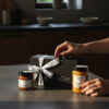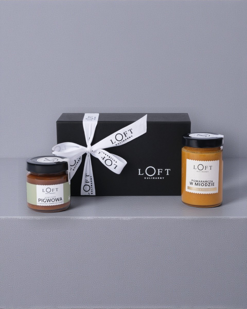 Pudełko jednoczęściowe na magnes czarne S 21,5 x 12 x 8 oraz wstążka z napisem Loft Kulinarny.