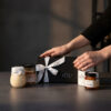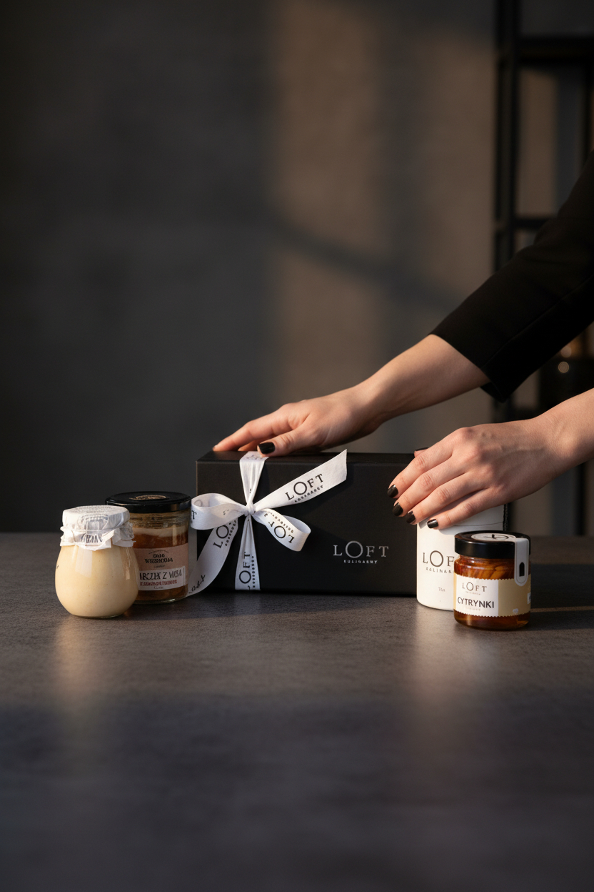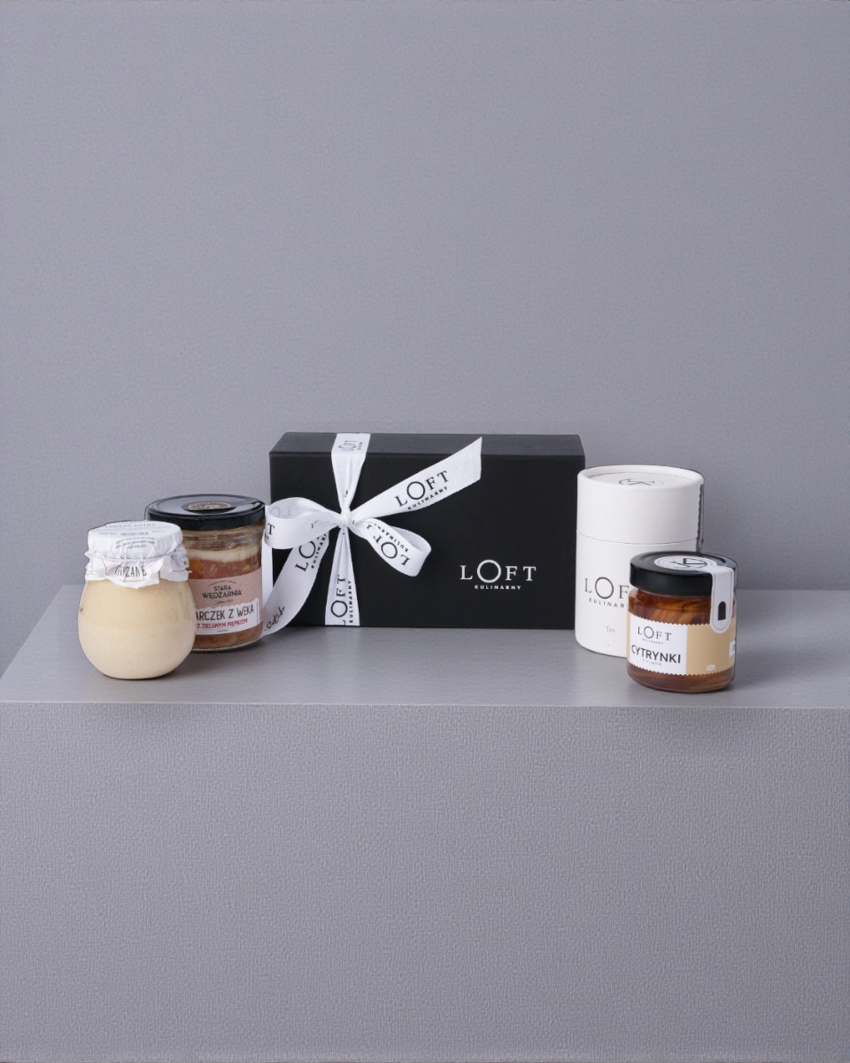 Pudełko jednoczęściowe na magnes czarne S 21,5 x 12 x 8 oraz wstążka z napisem Loft Kulinarny.