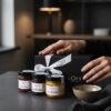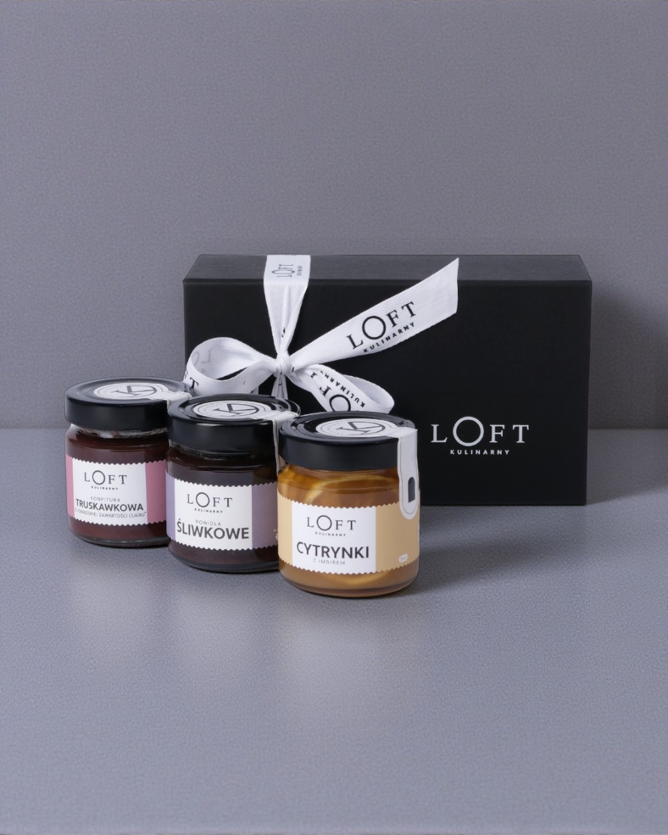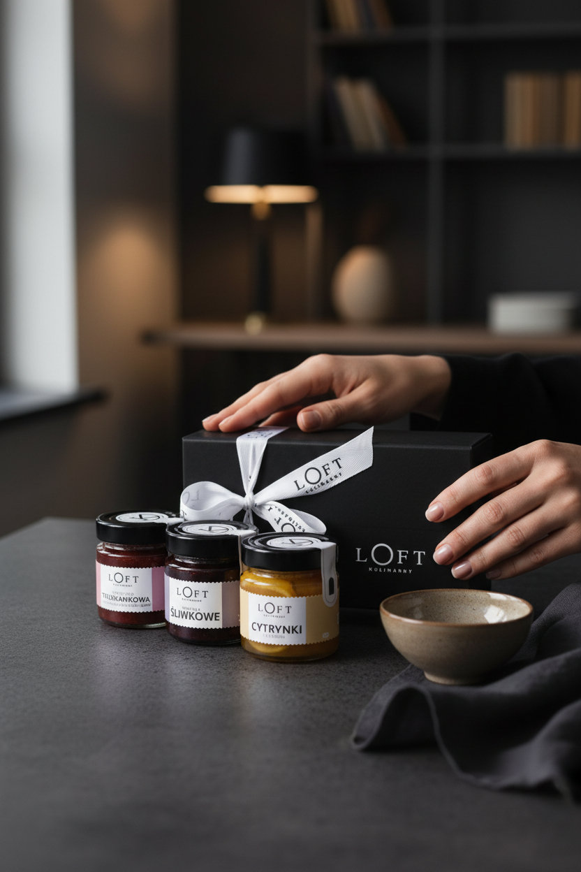 Pudełko jednoczęściowe na magnes czarne S 21,5 x 12 x 8 oraz wstążka z napisem Loft Kulinarny.