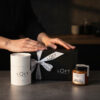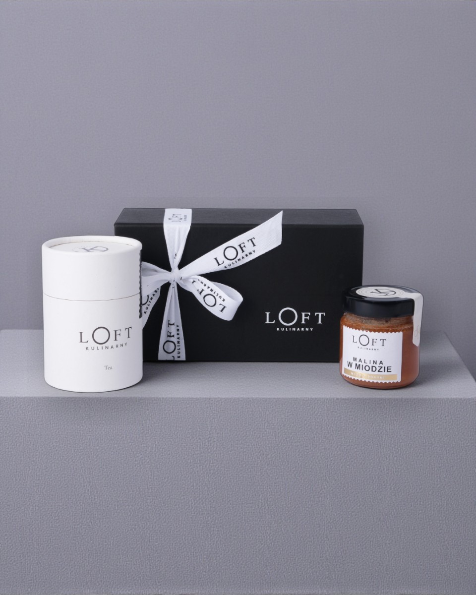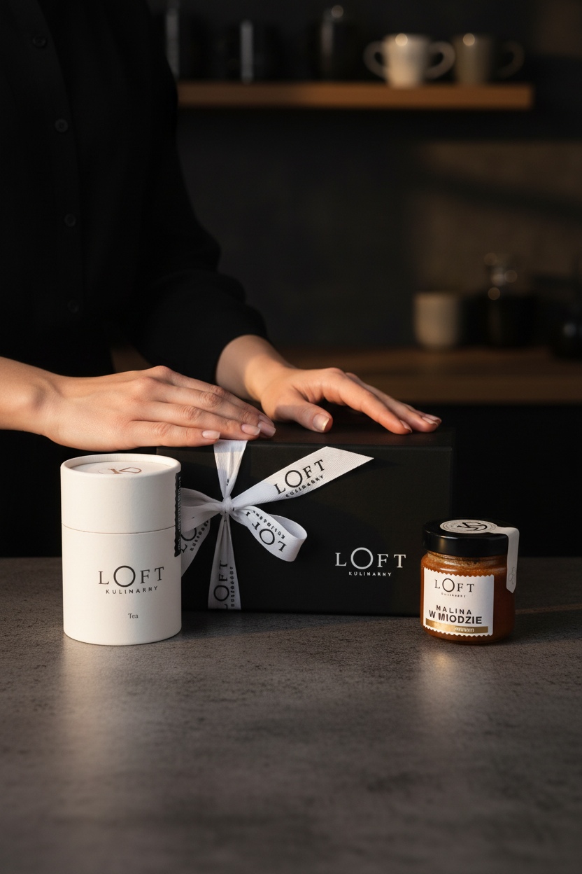 Pudełko jednoczęściowe na magnes czarne S 21,5 x 12 x 8 oraz wstążka z napisem Loft Kulinarny.