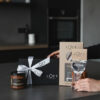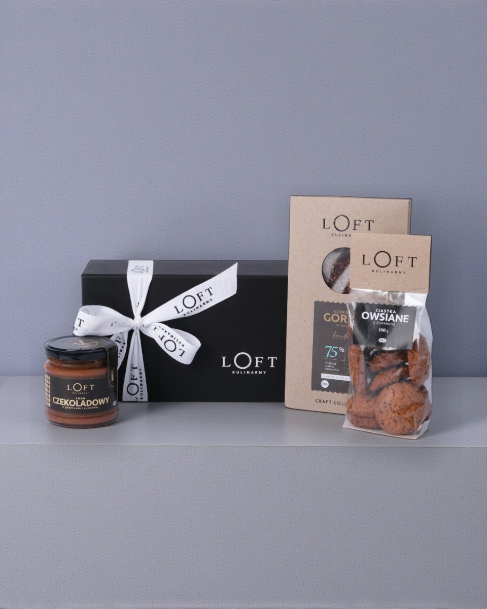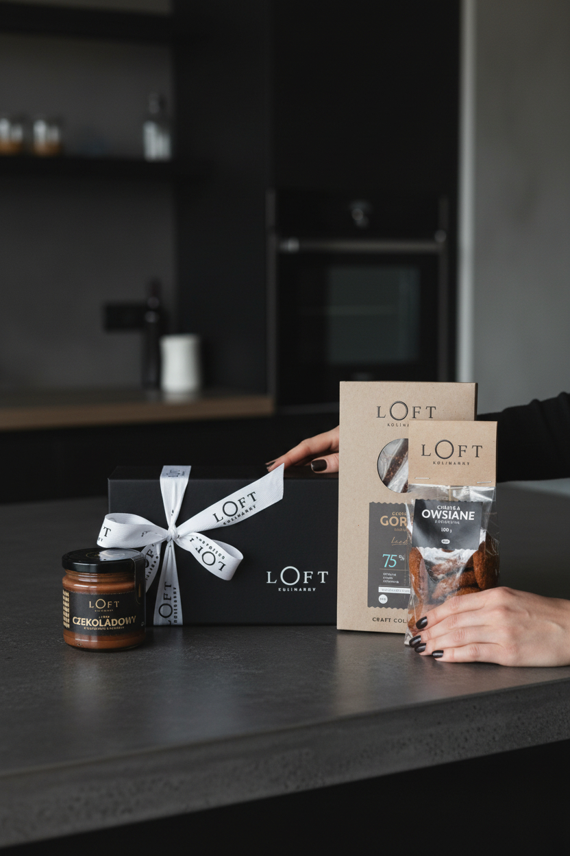 Pudełko jednoczęściowe na magnes czarne S 21,5 x 12 x 8 oraz wstążka z napisem Loft Kulinarny.