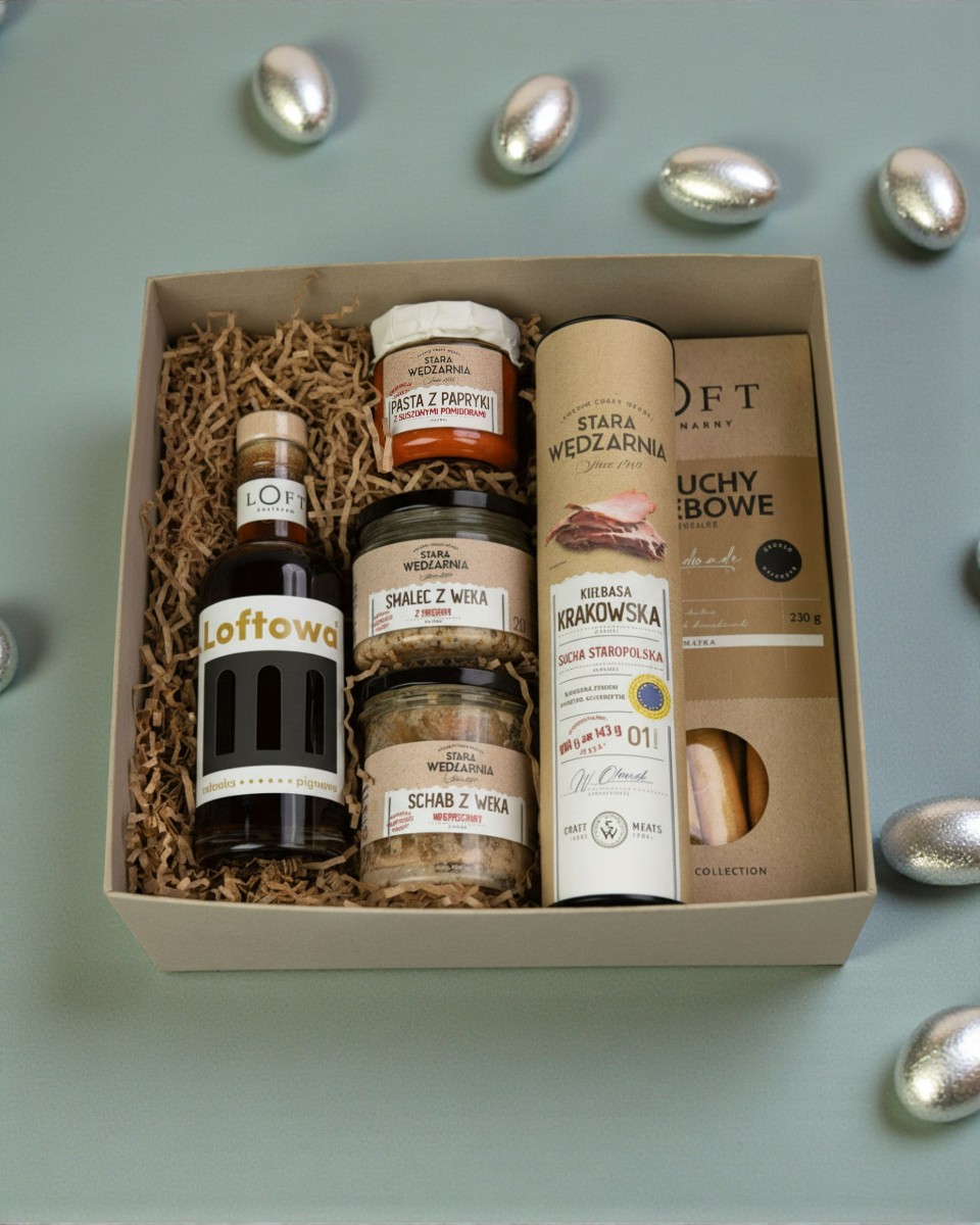 Ten zestaw prezentowy Loft Kulinarny powstał z myślą o świadomym obdarowywaniu – estetycznym, jakościowym i dopracowanym w każdym detalu. To wielkanocny prezent premium o wytrawnym charakterze, który łączy rzemieślnicze smaki z elegancką formą podania.